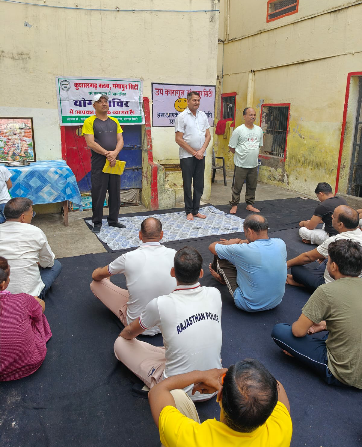 गंगापुर सिटी में 11वें अंतराष्ट्रीय योग दिवस के उपलक्ष्य में कुशालगढ़ क्लब द्वारा उप जिला कारागृह में जेलर सुखवीर सिंह के निर्देशन में स्टॉप ओर बंदियों को योग गुरु गोविंद नारायण शर्मा के द्वारा योगासन करवाया गया। योगासन कार्यक्रम का शुभारंभ मुख्य अतिथि जेलर सुखवीर सिंह,विशिष्ट अतिथि कुशालगढ़ क्लब चेयरमैन राजा लक्ष्मी कांत शर्मा, योग गुरु ओर गौ सेवा समिति अध्यक्ष गोविंद नारायण शर्मा द्वारा दीप प्रज्वलित कर किया गया। कुशालगढ़ क्लब चेयरमैन लक्ष्मी कांत शर्मा ने बंदियों और स्टाफ को योग के बारे में संक्षिप्त जानकारी दी। योग गुरु गोविंद नारायण द्वारा सभी योग करवाया गया और योग ओर आसनों के बारे में विस्तार से जानकारी दी। जेलर सुखवीर सिंह ने बंदियों को प्रतिदिन योगाभ्यास करने को कहा और योग गुरु गोविंद नारायण शर्मा और क्लब के कार्यों की सराहना की।