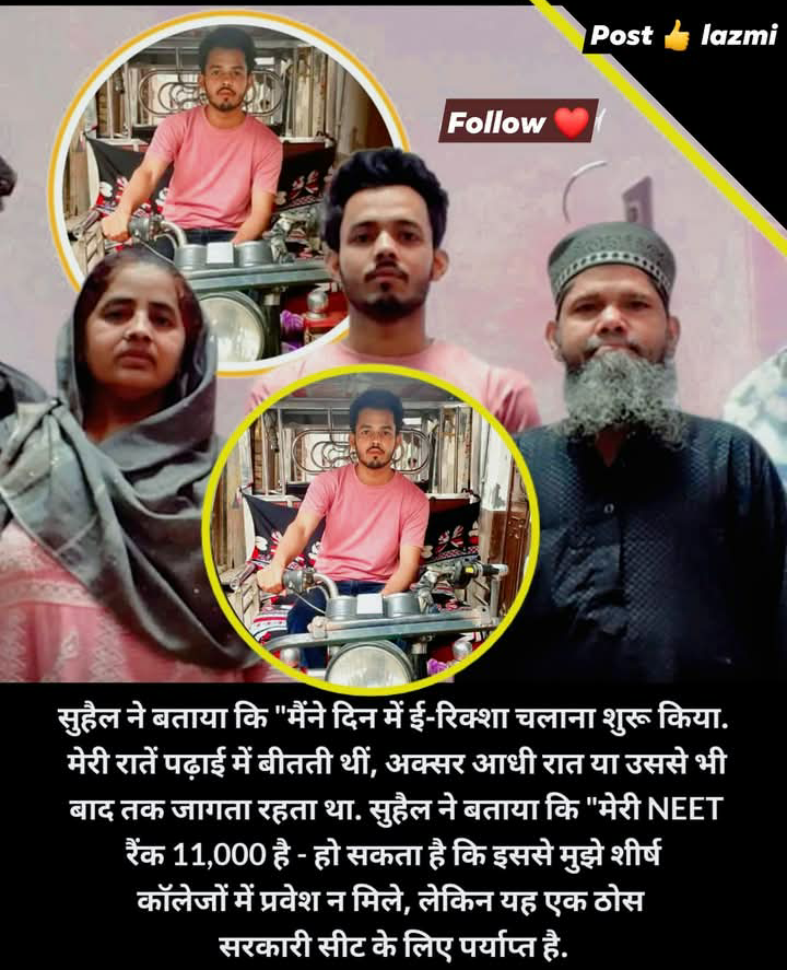 सुहेल की यह कहानी सिर्फ एक स्टूडेंट की नहीं, बल्कि जिद, मेहनत और सपनों को सच्चाई में बदलने वाले हौसले की कहानी है। एक ऐसे लड़के की जो दिन में ई-रिक्शा चलाता था और रात में डॉक्टर बनने के लिए पढ़ाई करता था।