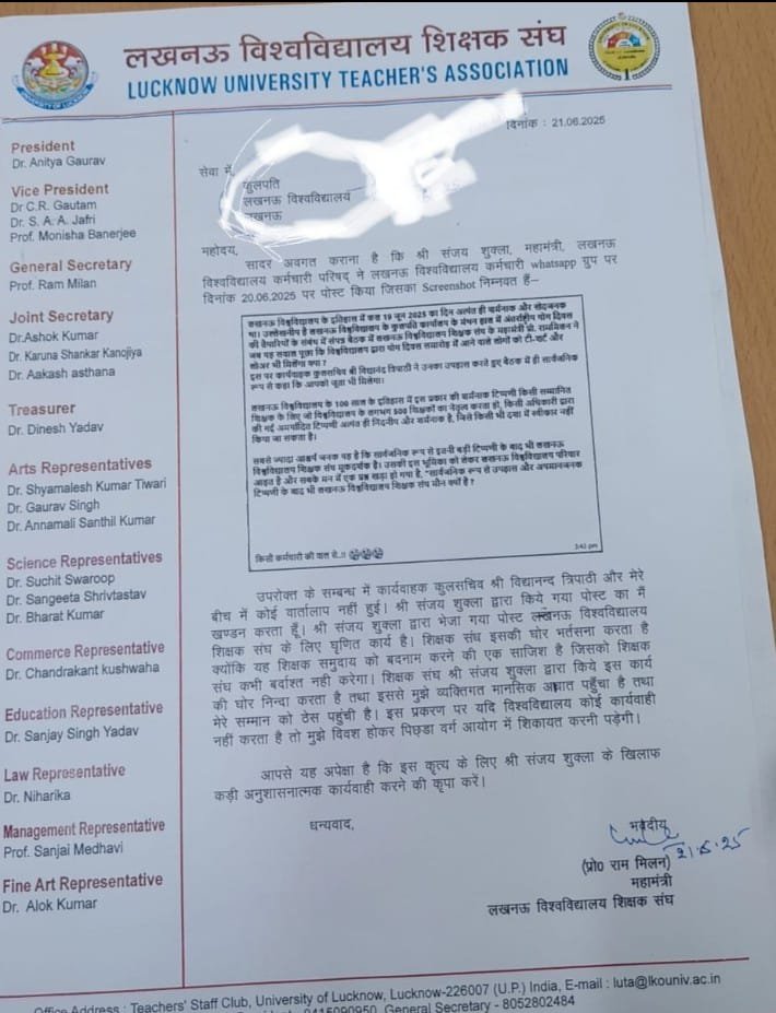 लखनऊ। अंतर्राष्ट्रीय योग दिवस की तैयारियों के संबंध में 19 जून 2025 को तत्कालीन रजिस्ट्रार विद्यानंद त्रिपाठी द्वारा बुलाई बैठक में लखनऊ विश्वविद्यालय टीचर्स एसोसिएशन के महामंत्री राममिलन यादव पर उनके द्वारा कथित टिप्पणी किए जाने के मामले ने तूल पकड़ लिया है। इस मामले में राममिलन यादव की सफाई आने के कई दिन बाद अब इस मामले में नवनियुक्त रजिस्ट्रार डॉक्टर भावना मिश्रा ने जांच बैठा दी है। दरअसल योग दिवस की तैयारी की बैठक के अगले दिन लखनऊ विश्वविद्यालय कर्मचारी परिषद संघ के महामंत्री संजय शुक्ला ने अपने व्हाट्सएप ग्रुप पर यह लिखा था कि बैठक के दौरान लूटा महामंत्री राम मिलन यादव ने ज़ब तत्कालीन रजिस्ट्रार विद्यानंद त्रिपाठी से यह बात पूछी कि योग दिवस समारोह में आने वाले लोगों को टी-शर्ट और लोअर भी मिलेगा क्या? इस पर कार्यवाहक कुलसचिव विद्यानंद त्रिपाठी ने उनका उपहास उड़ाते हुए बैठक में ही सार्वजनिक रूप से कहा कि आपको लोअर टीशर्ट के साथ में जूता भी मिलेगा। संजय शुक्ला ने अपने व्हाट्सएप ग्रुप पर इस घटना को ऐतिहासिक घटना बताते हुए इस पर रोष जताया था कि शिक्षक संघ के महामंत्री पर इस तरह की टिप्पणी होना बहुत ही गलत है यह व्हाट्सएप इसका स्क्रीनशॉट वायरल हो गया और इसके बाद एक चैनल ने इस पर स्टोरी कर दी जिस पर यह मामला और गर्म आ गया बताया जाता है कि योग दिवस के तुरंत बाद लूट महामंत्री राम मिलन यादव ने भी कुलपति को भेज अपने एक पत्र में इस पूरे प्रकरण में अपनी सफाई दी थी और कहा था कि उनके सामने ऐसी कोई घटना ही नहीं हुई बताते हैं कि इसके बाद कर्मचारी संगठन के महामंत्री संजय शुक्ला ने रजिस्ट्रार और कुलपति को एक और पत्र दिया जिस पर अब लखनऊ विश्वविद्यालय की रजिस्टर्ड डॉक्टर भावना मिश्रा ने 3 सदस्यीय जांच कमेटी बैठाते हुए इस मामले की पूरी जांच कराने की बात कही है।