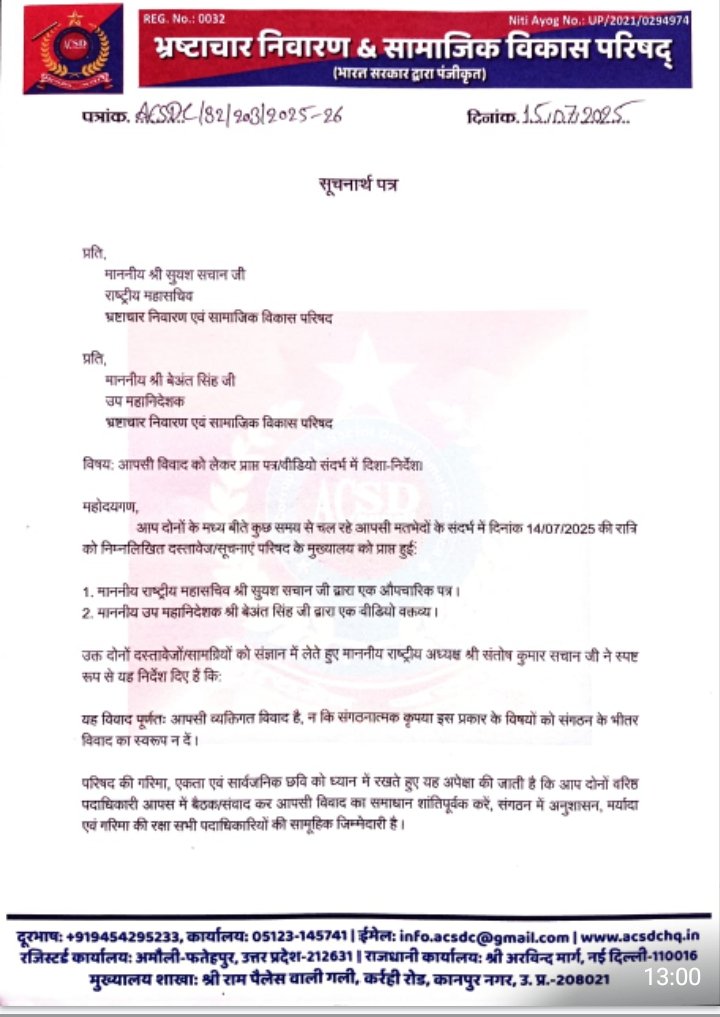 भ्रष्टाचार निवारण एवं सामाजिक विकास परिषद के दो वरिष्ठ पदाधिकारियों – राष्ट्रीय महासचिव सुयश सचान एवं उप महानिदेशक बेअंत सिंह – के मध्य उत्पन्न हुए आपसी विवाद को लेकर परिषद के मुख्यालय को दिनांक 14 जुलाई की रात्रि को एक पत्र एवं एक वीडियो प्राप्त हुए।