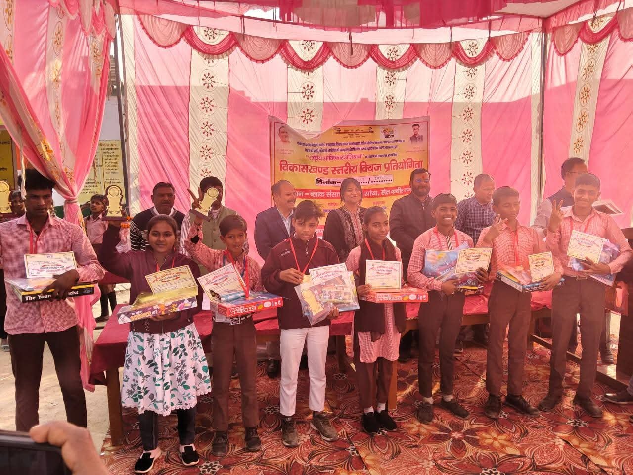 आज जिला संवाददाता अर्जुन सिंह संत कबीर विकासखंड सांथा दिनांक – 06/12/2025 को राष्ट्रीय आविष्कार अभियान के तहत विकास खंड स्तरीय क्विज प्रतियोगिता कार्यक्रम के अंतर्गत विकास खंड सांथा जनपद संत ककबीर नगर के कम्पोजिट विद्द्यालय गोइठहा में विभिन्न स्कूलों से आये हुए प्रतिभागी छात्रों में से विजेता बालक एवं बालिकाओ को प्रशस्ति पत्र एवं मेडल देकर सम्मानित करते हुए बी0ई0ओ0 सांथा गरिमा यादव जी एवं सहायक विकास अधिकारी पंचायत श्री मोइनुद्दीन सिद्दीकी साहब जी व अध्यापक गण आदि।