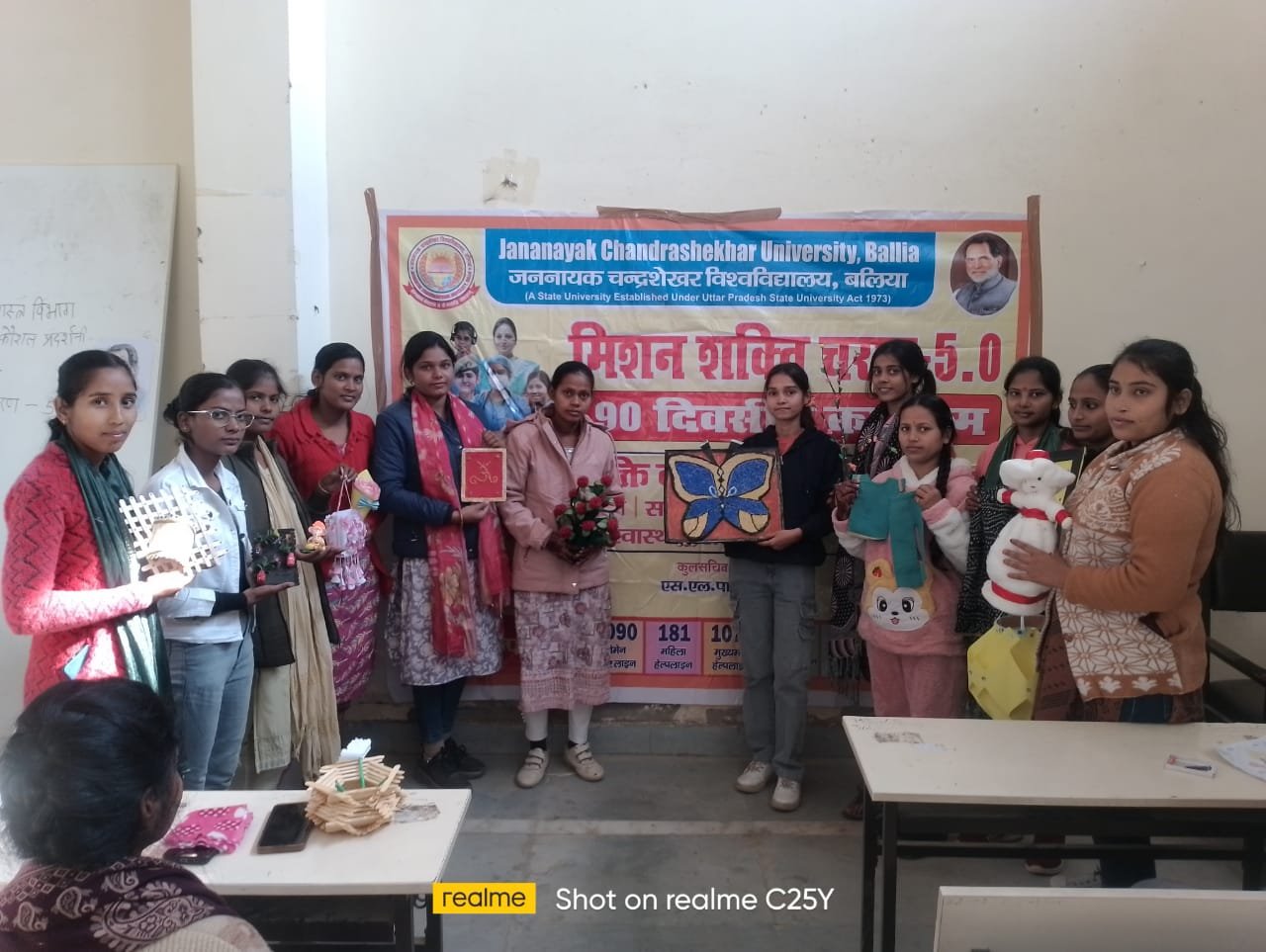 *बलिया*-उत्तर प्रदेश सरकार के महत्वकांक्षी परियोजना मिशन शक्ति चरण-5.0 के अंतर्गत जननायक चंद्रशेखर विश्वविद्यालय के कुलपति प्रोफेसर संजीत कुमार गुप्ता के दिशानिर्देश में सामाजशास्त्र विभाग द्वारा *हस्त कला एवं कौशल प्रदर्शनी’ का आयोजन आचार्य हजारी प्रसाद द्विवेदी भवन में किया गया इस प्रदर्शनी का मुख्य उद्देश्य गृहणियों को आर्थिक रूप से सशक्त बनाना, जिसमें समाजशास्त्र विभाग के परास्नातक के विद्यार्थियों ने घर के वेस्टेज सामान से उपयोगी वस्तुओं को तैयार कर उसका प्रदर्शन किया जो कि महिलाओं को कौशल दक्षता प्रदान करेंगी जिससे वो आर्थिक रूप से सबल हो सकेंगी।