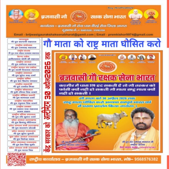 अगर केंद्र सरकार ने 30 अप्रैल 2026 तक गौ माता को राष्ट्र माता घोषित नही किया तो पूरे भारत वर्ष में बृजवासी गौ रक्षक भारत सेना संगठन हर जिले तहसील स्तर पर बड़ी संख्या में धरना प्रदर्शन करेंगे और गौ माता को राष्ट्र माता घोषित करके ही दम लेंगे।