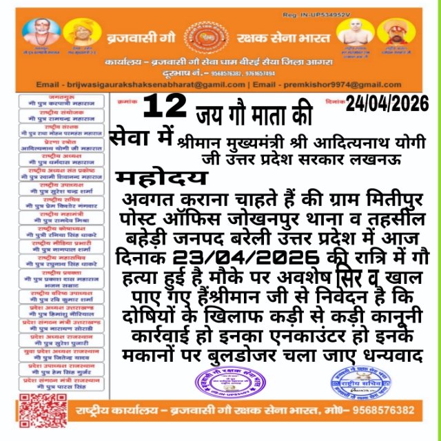 बताते हैं कि आज 23/04/026/रात में थाना बहेड़ी के जंगल में गौ माता ब नन्दी बाबा की हत्या की गई है जिसके अवशेष प्राप्त हुए हैं।